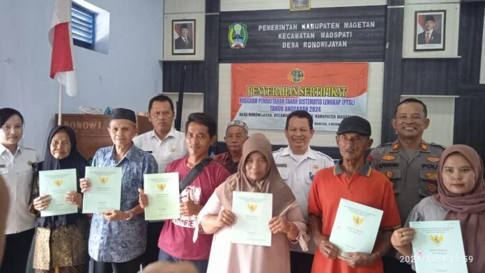 Pewarta.TV, Magetan – Pemerintah kembali menorehkan pencapaian penting dalam pelayanan kepada masyarakat melalui Program Pendaftaran Tanah Sistematis Lengkap (PTSL). Pada tahun 2024, sebanyak 367 bidang tanah telah berhasil disertipikasi dan diserahkan kepada warga Desa Ronowijayan, Kecamatan Maospati, Kabupaten Magetan. Acara penyerahan berlangsung di Balai Desa setmpat, Rabu (4/12/2024).
