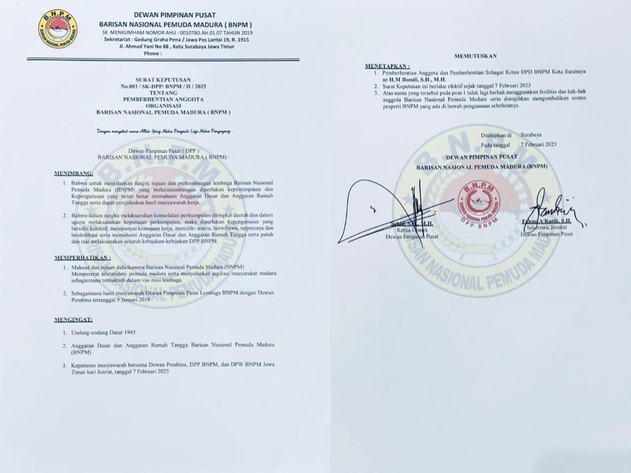 “BNPM adalah organisasi yang menjunjung tinggi integritas, loyalitas, dan komitmen dalam membela kepentingan masyarakat. Kami tidak akan mentoleransi siapapun yang tidak bisa menjaga amanah. Keputusan ini sudah final dan wajib dipatuhi oleh semua pihak. Kepada instansi kepolisian, DPRD, dan pemerintah Kota Surabaya, kami tegaskan agar tidak lagi mengakui saudara H.M. Rosuli sebagai bagian dari BNPM.” Sahid, S.H., M.H.