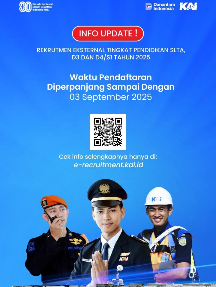 Pewarta.TV, Madiun – PT Kereta Api Indonesia (Persero) memperpanjang waktu pendaftaran untuk rekrutmen eksternal lulusan SLTA, D3, dan D4/S1 pada Tahun 2025 hingga 3 September 2025.