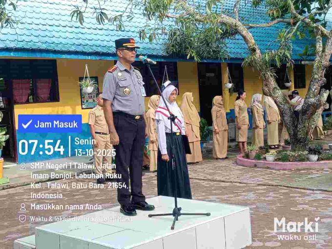 Pewarta.TV, Talawi – Suasana khidmat mewarnai UPT SMP Negeri 1 Talawi pada Senin, 13 Oktober 2025, saat Kepala Lembaga Pemasyarakatan (Kalapas) Kelas IIA Labuhan Ruku, Soetopo Berutu, bertindak sebagai pembina upacara. Upacara ini berlangsung di lapangan sekolah yang terletak di Jalan Pendidikan, Kelurahan Labuhan Ruku, Kecamatan Talawi, Kabupaten Batu Bara.