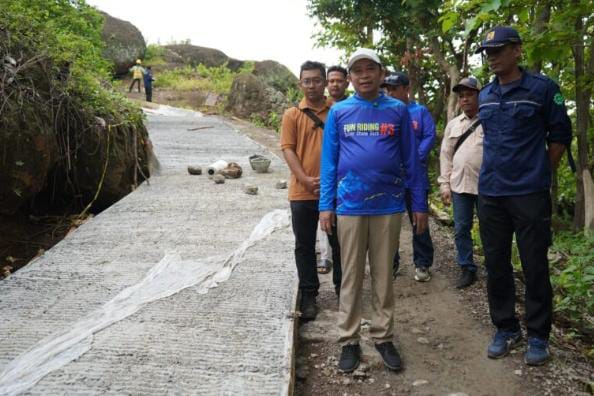 Bupati Bondowoso Abd Hamid Wahid, didampingi Plt. Kepala Dinas BSBK Bondowoso, Ansori meninjau langsung pekerjaan rekonstruksi jalan di kawasan wisata Batu So’on, Desa Solor, Kecamatan Cermee, Sabtu (22/11/2025).
