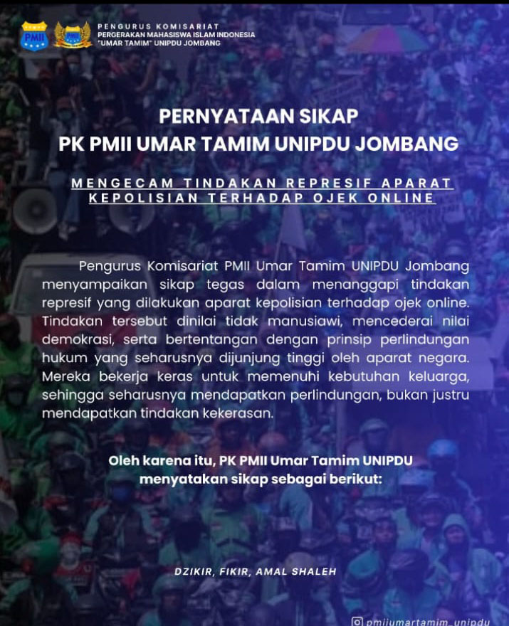Pewarta.TV, Jombang, 29 Agustus 2025 – Pengurus Komisariat PMII Umar Tamim UNIPDU Jombang merilis pernyataan sikap resmi yang mengecam tindakan represif aparat kepolisian terhadap pengemudi ojek online. Pernyataan ini disampaikan sebagai bentuk keprihatinan atas insiden yang terjadi, di mana tindakan aparat dinilai tidak manusiawi, mencederai nilai demokrasi, dan bertentangan dengan prinsip perlindungan hukum.