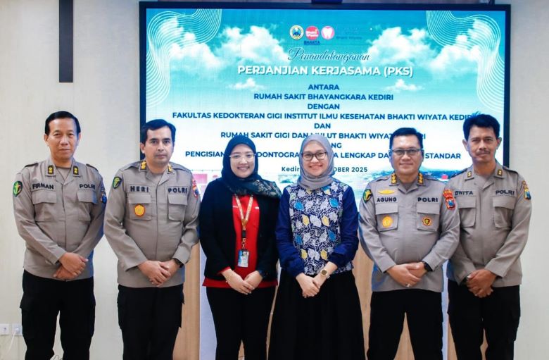 RS Bhayangkara Pelopori Pengisian Odontogram Standar DVI//Tanda Tangani Perjanjian Kerja Sama dengan FKG dan RSGM IIK Bhakta /Kota,Tidak hanya mengoptimalkan pelayanan kepada para pasien, RS Bhayangkara Kediri juga jadi pelopor pengisian odontogram atau gambaran gigi dan jaringan mulut dalam bentuk diagram. Senin (20/10/2025) pihaknya melakukan penandatanganan kerja sama dengan Fakultas Kedokteran Gigi (FKG) serta Rumah Sakit Gigi dan Mulut Institut Ilmu Kesehatan Bhakti Wiyata (IIK Bhakta).