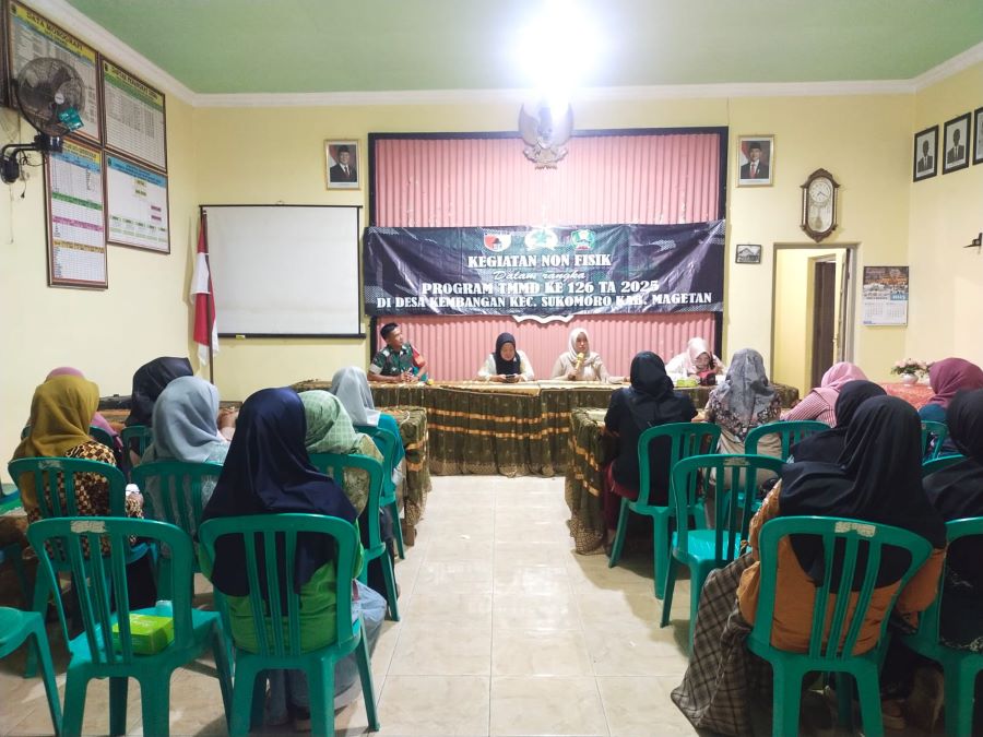 Pewarta.TV, Magetan – Mmendukung program nonfisik TNI Manunggal Membangun Desa (TMMD) ke-126, Satgas TMMD Kodim 0804/Magetan menggelar penyuluhan tentang pemberdayaan dan kesejahteraan keluarga di Balai Desa Kembangan, Kecamatan Sukomoro, Kabupaten Magetan, Selasa (28/10/2025) malam