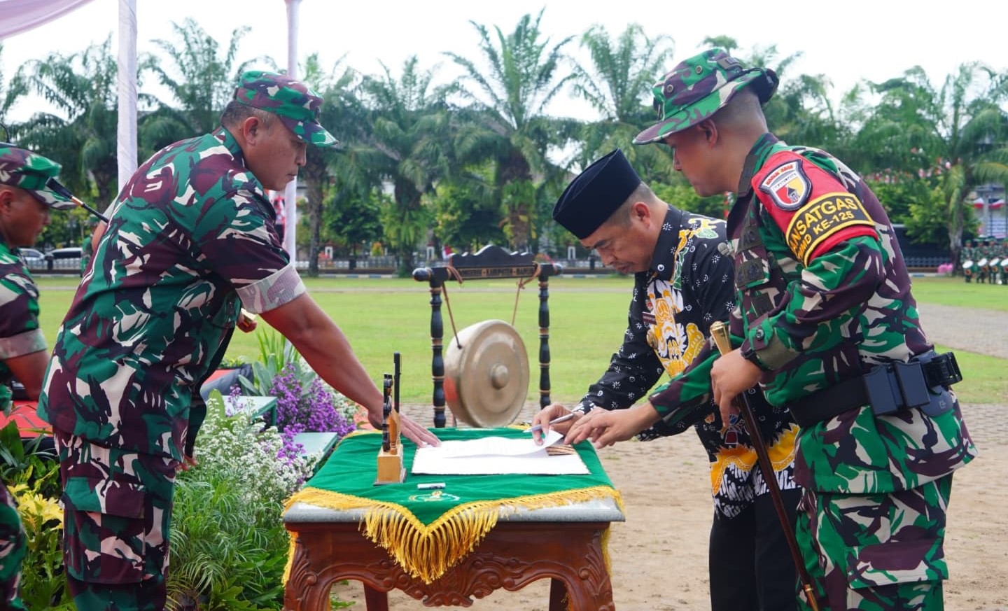 Bupati Madiun Hari Wuryanto (berpeci) menandatangani berita acara penyelesaian program TMMD ke -125, Kamis (21/8/2025)