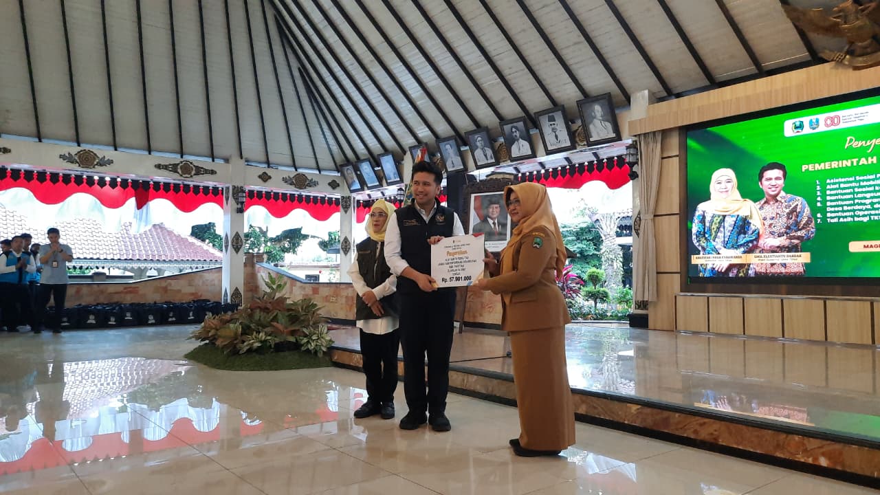 Wagub Jatim Emil Dardak secara simbolis menyerahkan Bantuan kepada Bupati Magetan Nanik Endang Rusminiarti, Senin, (25/8/2025)